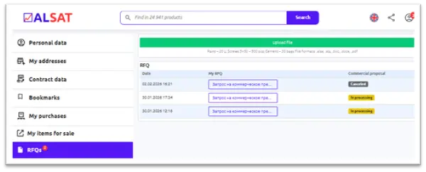 An RFQ is a common "purchase by list" format for corporate procurement, where a company submits a single request for several items: name, parameters, quantity, delivery terms, and conditions. In the traditional process, an RFQ often devolves into a chain of calls, emails, and disjointed responses. At 📈ALSAT this stage has been digitalized: one request, one status, one result for decision-making.