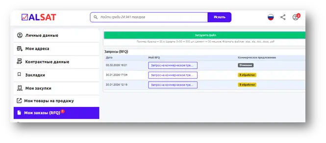 • Через личный кабинет на ALSAT.com.tm: зарегистрировавшись и добавив файл RFQ в аккаунте. Запрос можно отправить одним файлом, причём список принимается на любом удобном языке. Далее система использует алгоритмы обработки списка и интеллектуального сопоставления (с элементами искусственного интеллекта) для сравнения позиций с товарами в каталоге. Результаты и статусы обработки сохраняются в аккаунте, а о готовности ответа пользователь получает email-уведомление.